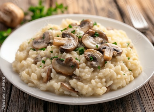 Delicious creamy risotto with fresh mushrooms, garnished with parsley and parmesan, served on a rustic wooden table.