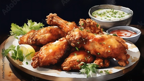 Delicious crispy fried Chicken drumsticks, wings surrounded by dipping sauces, lemon wedges, and fresh parsley