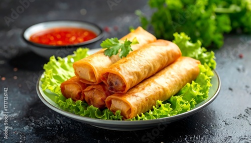 spring, fried, crispy, delicious, food, asian, cookery, snack, chili, sauce, lettuce, plate, dinner, lunch, meal, eat, tasty, receipe, cooking, eatery, menu, photo, image, fresh, healthy, vegetable, meat, pork meat, chicken, shrimp, seafood, dipping, spicey, sweet, savoury, flavorful, crunchy, texture, gold, brown, appetising, tempting, culinary, gastronomy, styling, composition, professional