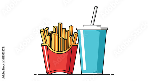 Delicious crispy golden french fries in a red carton box served with a refreshing cold blue beverage in a cup with a straw for a satisfying meal