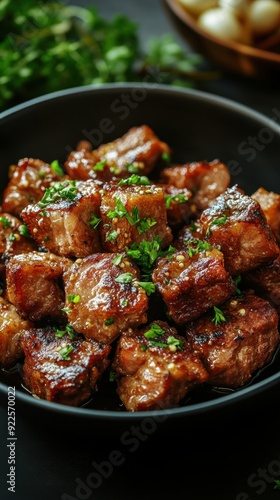 Delicious crispy pork belly bites garnished with fresh herbs, served in a stylish black bowl. Perfect for food lovers and chefs.