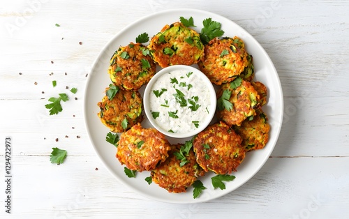 Delicious Crispy Zucchini Fritters with Creamy Dip, Top View