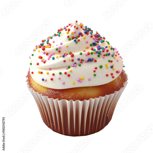 Delicious cupcake topped with fluffy white frosting and colorful sprinkles, perfect for celebrations and special occasions., isolated on a transparent background.