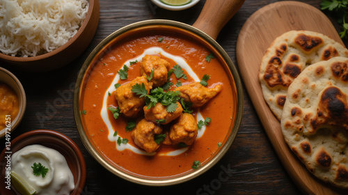 Delicious curry with cauliflower, rice, naan, and yogurt on wooden table