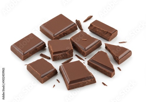 Delicious dark chocolate pieces scattered on white background tempting sweet treat rich brown tones close up shot satisfying texture