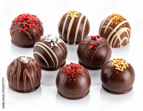 Delicious Dark Chocolate Truffles Assortment with Colorful Toppings on White Background with Reflection
