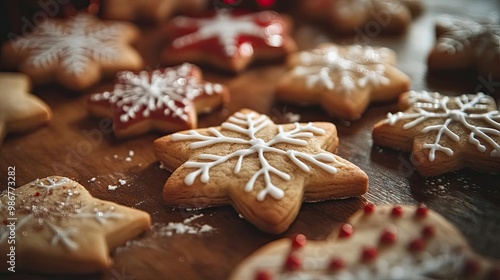 Delicious decorated cookies shaped like snowflakes, perfect for festive celebrations and holiday treats. Sweet and charming display.