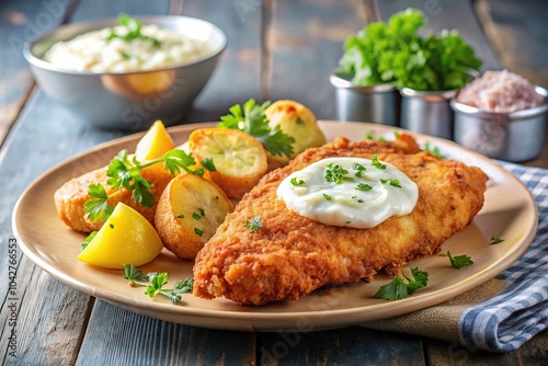 Delicious deep fried chicken with baked potato and tartar sauce on white background low angle view