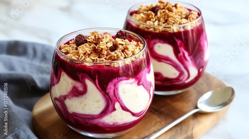 Delicious dessert featuring creamy layers with vibrant berry swirls and crunchy granola toppings in stylish glasses.