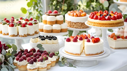Delicious dessert table display featuring mouthwatering cakes and pastries at a garden party celebration