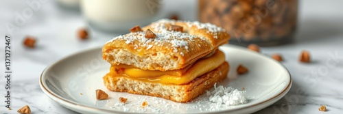 dessert, pastry, cream, filling, flaky, sweet, powdered sugar, plate, milk, crunchy, layered, food, treat, delicious, homemade, sugary, indulgence, bakery, epicure, snack, culinary, presentation, beautiful, creamy, texture, gold, baked, receipe, edible, sweet tooth, confection, brunch, decadent, favor, bite, epicure, pleasing, table setting, comfort food