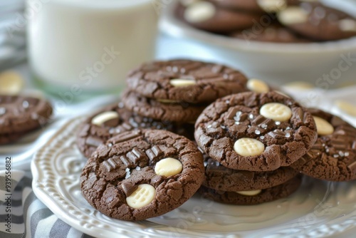 Delicious double chocolate chip cookies are stacked on a plate and ready to be enjoyed with a glass of milk