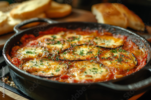 Delicious Eggplant Parmigiana Shakshuka served in a large skillet with fresh basil, ripe tomatoes, and garlic for a cozy meal