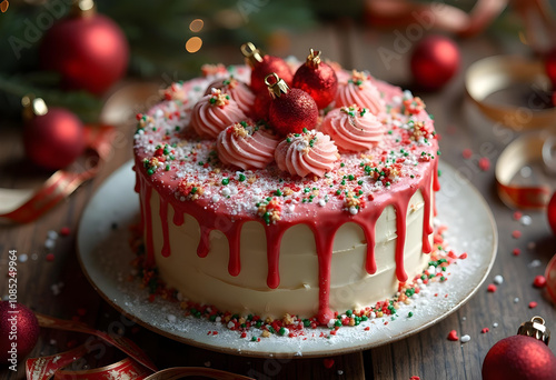 Delicious festive cake decorated with red icing, sprinkles, and ornaments, perfect for holiday celebrations and gatherings