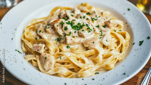 Delicious fettuccine pasta in creamy Alfredo sauce with chicken served on a plate
