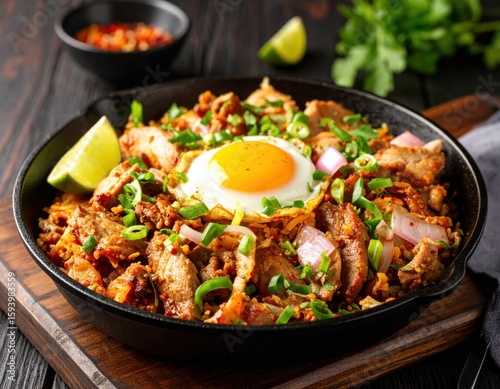 filipino, sizzling, platter, pork meat, dish, green, onion, lime, chili, pepper, traditional, food, culinary, delight, savoury, favor, cooked, garnished, herb, authentic, cookery, street, spicey, hearty, meal, asian, comfort, eatery, casual attire, dining, popular, colours, presentation, life events, hot, local, delicacy, profile, unique, ingredient, family, tasty, flavorful, culture, tradition, fresh, epicure, mouth-watering