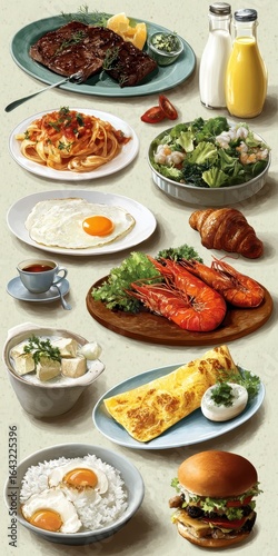 food, cookery, dish, meal, culinary, cooking, receipe, breakfast, lunch, dinner, pasta, steak, shrimp, egg, rice, salad, croissant, omelet, tofu, burger, healthy, delicious, tasty, appetising, fresh, ingredient, epicure, home cooking, seafood, meat, vegetable, dairy, carb, protein, fats, nourishment
