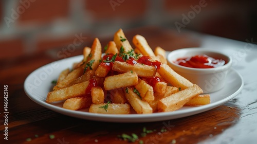 Delicious French Fries Served on White Plate with Spicy Chili Sauce Isolated on Brick Background
