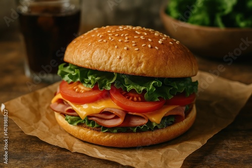 sandwich, food, burger, face, wooden, paper, advertisement, delicious, realistic, cheese, modern, tomatoes, photo, table, brand, wooden table, brown, cup, authentic, fast food, epicure, fresh, style, image, mug, more, appetising, brown paper, ingredient, lettuce, sesame, lunch, fast, meal, real, bun, ham, juicy, tasty, crispy, option, savoury, cheddar, closeup, delight