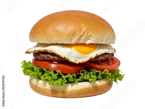 burger, fried, egg, hamburger, beef, fast, food, junk, breakfast, tomatoes, lettuce, sesame, bun, patty, yolk, photo, isolated, transparent, background, clip art, cut-out, high, resolution, delicious, appetising, tasty, eatery, cafes, menu, meal, dinner, lunch