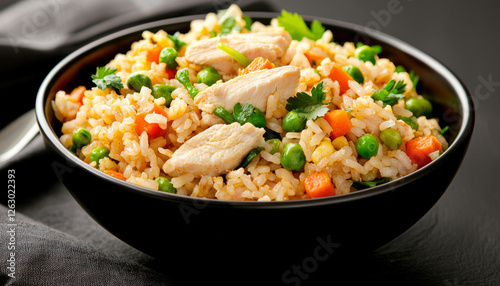 Delicious fried rice with chicken, peas, and colorful vegetables