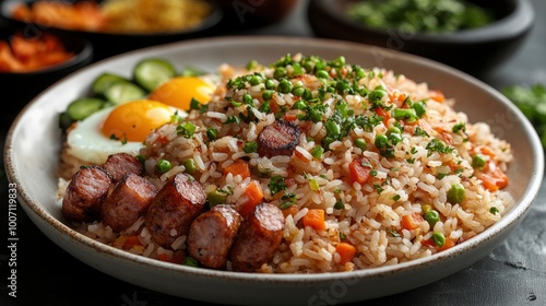 Delicious Fried Rice with Sausage, Peas, Carrots, and Fried Eggs