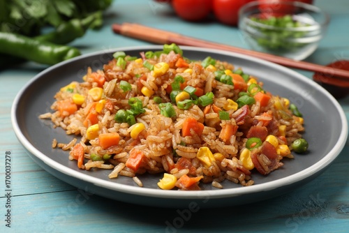 Delicious fried rice with vegetables and bacon on light blue wooden table, closeup