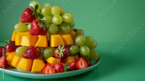 fruit, platter, strawberry, grape, mango, healthy, eating, snack, dessert, fresh, sweet, juicy, delicious, colourful, red, green, yellow, summer, tropical, vitamin, nourishment, diet, vegetarian, vegan, food, plate, green background