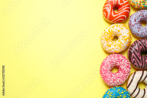 Delicious glazed donuts on yellow background, flat lay. Space for text