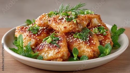 Delicious Golden Brown Fried Chicken Wings Glazed with Sweet Sauce Garnished with Fresh Green Herbs and Sesame Seeds Served on a White Plate with Mint Leaves on a Wooden Tabletop