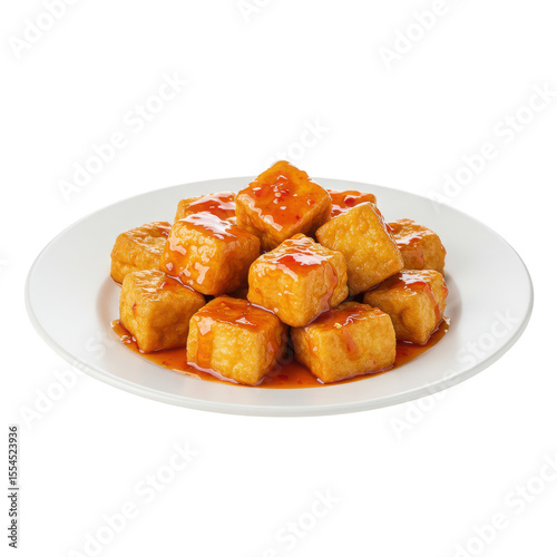Delicious golden tofu cubes drizzled with spicy sauce on a white plate, enticing meal