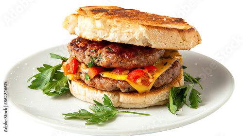 Delicious gourmet burger with double patties, cheese, and fresh tomatoes on a white plate garnished with parsley.