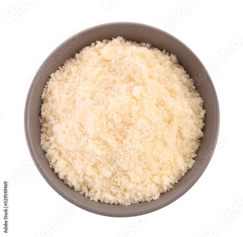 Delicious grated parmesan cheese in bowl isolated on white, top view