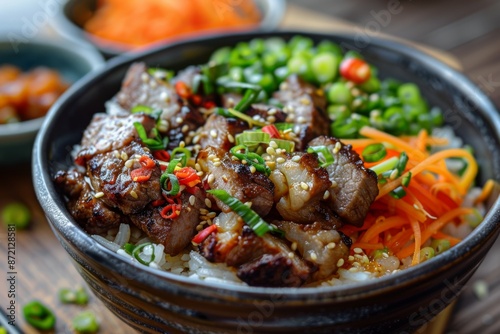 food, asian cuisine, vegetable, carrot, green onion, sesame seeds, garnish, fresh, healthy, appetising, meal, dish, epicure, culinary, homemade, traditional, savoury, delicious, eatery, lunch, dinner, colourful, vibrant, bowl, closeup, wooden table, culinary arts, soy sauce, chopstick, exquisite, fine dining, epicure, cookery, delicacy, aromatic, mouth-watering
