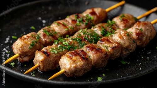 skewer, grilled, meat, pork meat, bar-b-q, food, cookery, tapas, dinner, lunch, summer, grill, cooked, favor, delicious, tasty, juicy, protein, healthy, diet, meal, easy, receipe, grilling, marinade, spice, herb, garnish, parsley, eatery, black, plate, food photography, cooking
