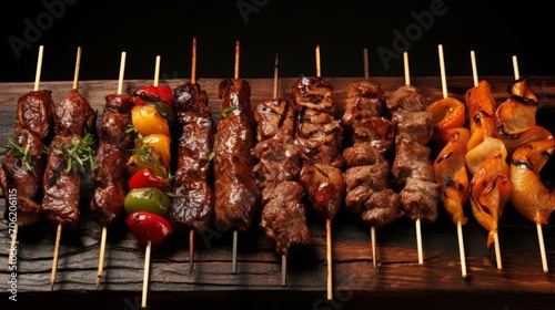 skewer, grilled, meat, vegetable, food, bar-b-q, bar-b-q, tasty, delicious, meal, dinner, cooked, roasted, beef, chicken, pepper, onion, tomatoes, mushroom, courgette, kebob, cookery, epicure, appetising, savoury, spiced, marinated, wooden, board, herb, fresh, colours, contrast, detail, texture, favor, presentation, garnish, sauce, stick, ready, serve, enjoy, summer, party