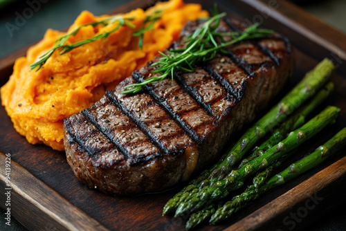 Delicious grilled steak served with creamy mashed sweet potato and fresh asparagus, perfect for gourmet dining.