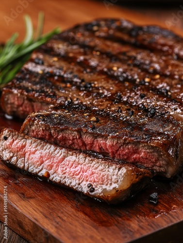 Delicious Grilled Steak Slices on Wooden Board with Rosemary Sprig Ready for Serving Meal