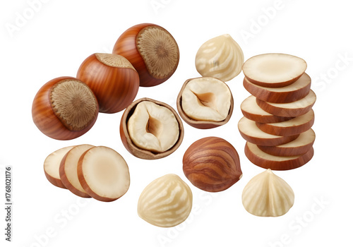 Delicious hazelnuts and their slices perfect for product advertising photography, isolated on white or transparent background. PNG