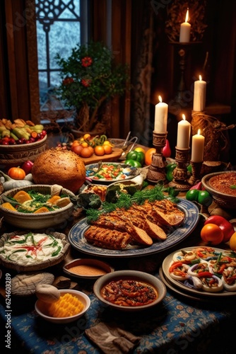 delicious holiday feast with traditional dishes on table, created with generative ai