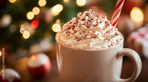 Delicious holiday hot chocolate topped with whipped cream and peppermint stripes against a festive background filled with decorations
