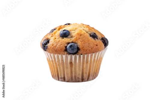 Delicious homemade blueberry muffin with visible berries baked in a paper liner isolated on transparent background