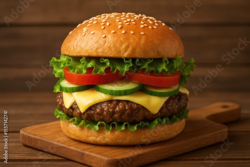 Delicious homemade burger topped with fresh vegetables and cheese on a chopping board