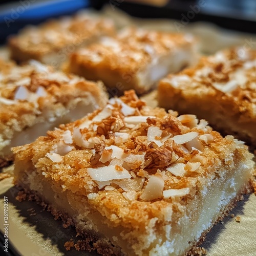 Delicious Homemade Coconut Bars With a Crispy Topping Served Fresh From the Oven in a Cozy Kitchen Setting