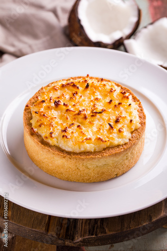 dessert, coconut, brazilian, homemade, cake, sweet, baking, toasted, delicious, exotic, tropical, treat, epicure, snack, plate, closeup, food, rustic, wooden table, golden brown, texture, favor, culinary, pastry, kitchen, traditional, creative, receipe, sugar, cookery, baked goods, fine dining, indulgence, fresh, decorative, serving, tempting, crispy