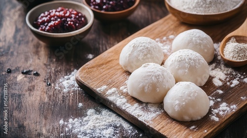 Delicious homemade dough balls recipe for baking on wooden board with jam and flour bowl