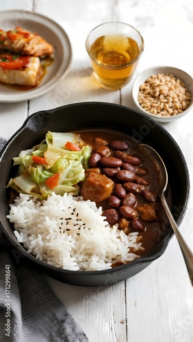 Delicious Homemade Red Bean Curry with Rice and Bok Choy in Cast Iron Skillet for Food Blog and Restaurant Menu