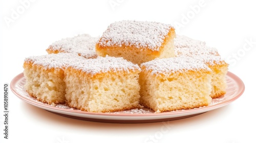 Delicious homemade vanilla sponge cake squares with powdered sugar