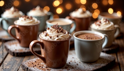 Delicious hot chocolate cups topped with whipped cream and chocolate shavings on a festive table