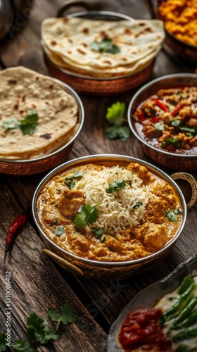 Delicious Indian dishes are beautifully arranged on a rustic wooden table, showcasing rich colors and textures